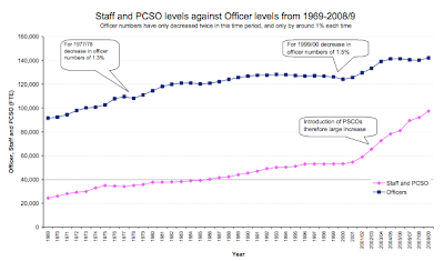 UPDATE: A commenter writes "I read somewhere as well that we have never had such a high ratio of Police to general Public. If that is true, why are tey unable to attend burglaries etc, and try not to attend car break-ins at all." You are right, the below chart from the same report, shows that we do currently have record numbers of Police and PCSOs: